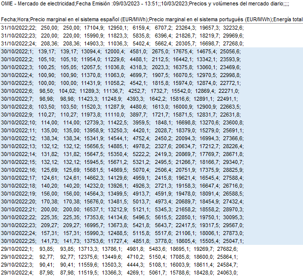 In this example we use data from the data provider OMIE, who is publishing electricity prices and volumes for Spain, Portugal and Iberia.