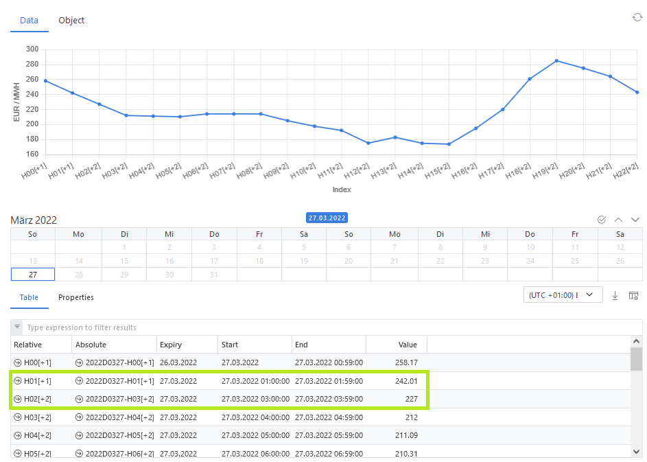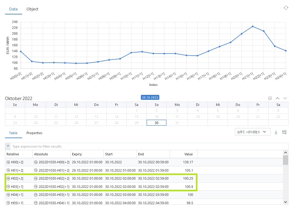 The values are loaded from the input raw file. In ODSL - according to the following screenshot - we notice the expected missing hour 2:00 - 2:59, (absolute tenor), whereas the relative tenors show up nicely without a gap.