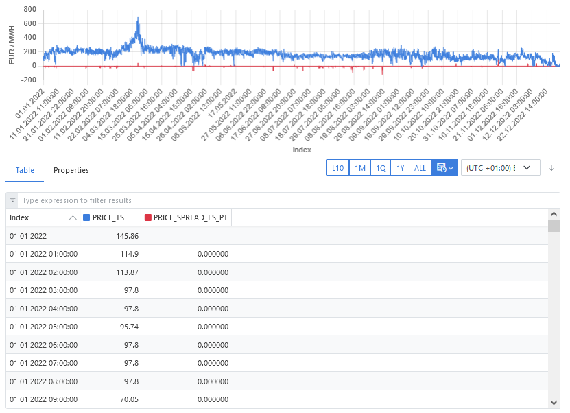 Calculating a spread between the prices for Spain and Portugal should always be 0 in this case. Sure, this can easily be proven or rejected using Excel. But an ODSL smart time series can be used as a basis for notifications in case the user wants to be informed when the spread between the prices for Spain and Portugal is not 0.