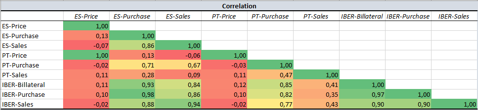 - There is a high dependency between the Spain sales and also Spain purchase volumes and the Iberian volumes (correlation coefficient between 0,84 and 0,98).