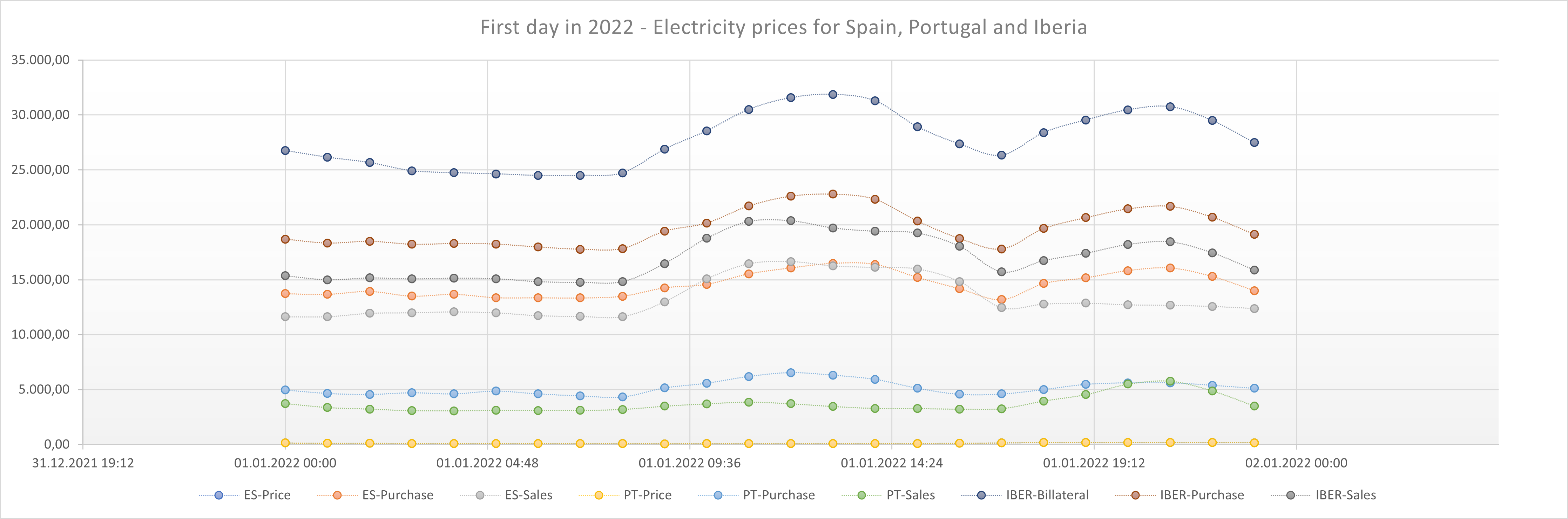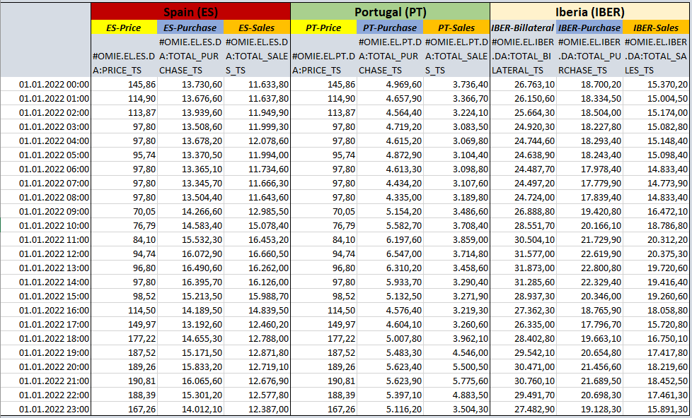 As an example we use Iberian Electricity data published by OMIE. Specifically we use electricity prices, purchase and sales volumes for Spain, Portugal and Iberia for the year 2022 on an hourly granularity.