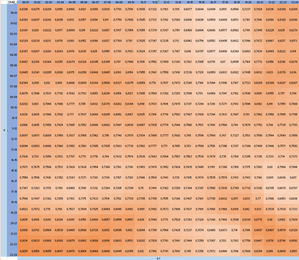 The correlation between day d and day d-1 of the 24 hours granularity over 364 days range (due to a shift of 1 day) is quite high with correlation coefficients between 63,69% and 92,51%.