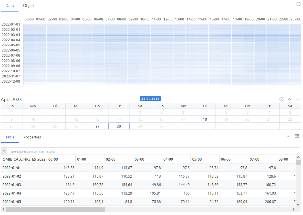 Another way to get insights to the data is to convert this time series into a matrix, where columns represent the hours of the day 1-24 and rows represent the days of the year 1-365. This transformed view supports the task to analyse the same data input but per hour of the day over time. ODSL supports it with a function toMatrix()