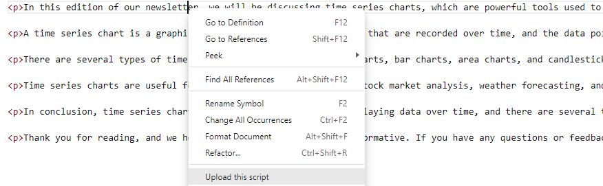 I did a small amount of HTML edits (adding <p> tags around each paragragh) and uploaded the file from VSCode using the Upload this script context menu item from the OpenDataDSL VS Code extension.