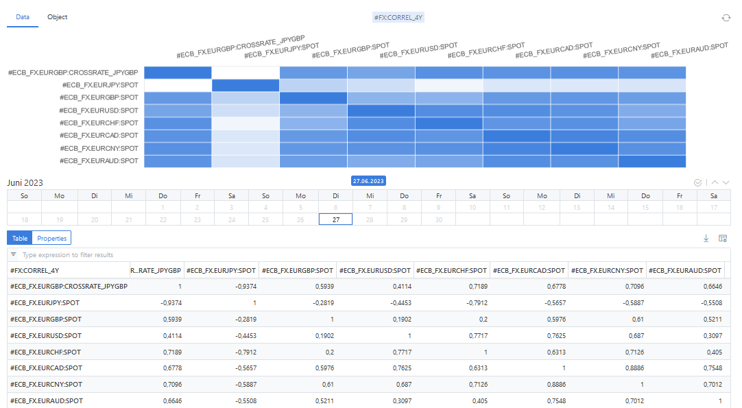 The correlations are calculated in an ODSL script and shown up in a matrix. The highest correlations are: 0.8886 for EUR/CAD vs. EUR/CNY followed by 0.7717 for EUR/USD vs. EUR/CHF and 0.7625 for EUR/CAD vs. EUR/USD. The exchange rates against EUR/JPY are negatively correlated.