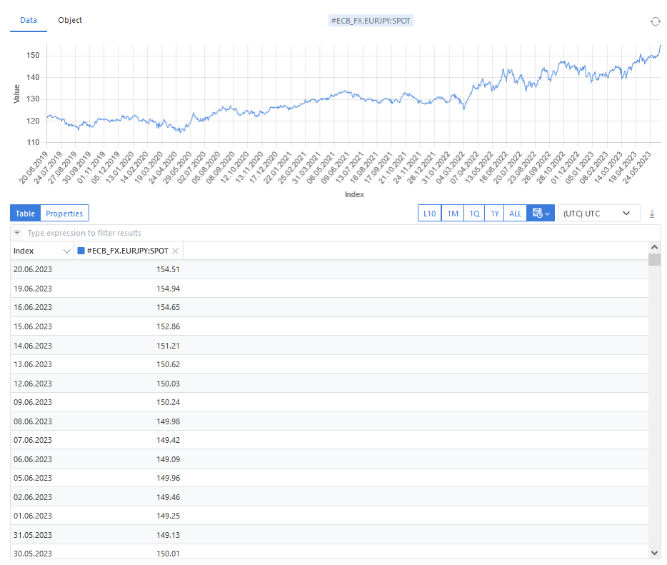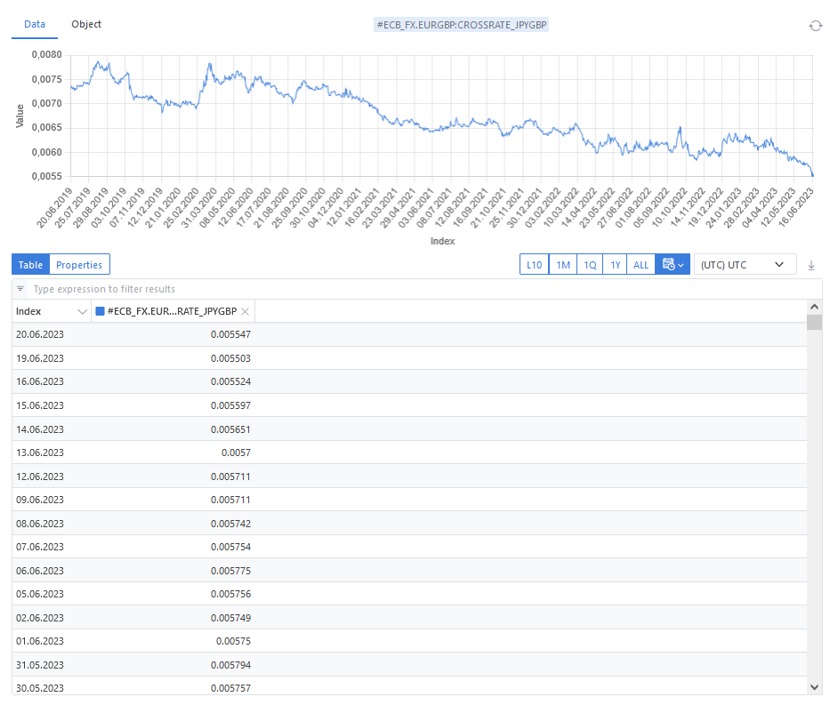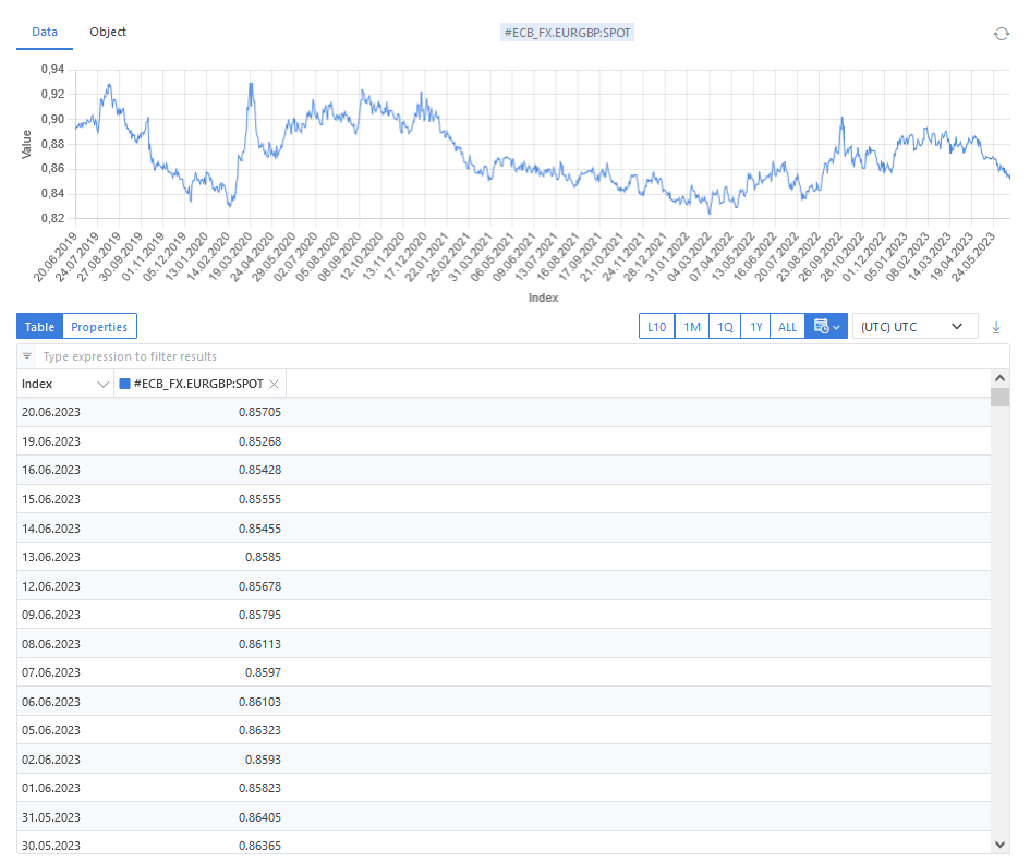 Amongst other currency exchange rate providers we also store data from European Central Bank and use it in the following example. The time horizone that is chosen here is 20 June 2019 until 20 June 2023.