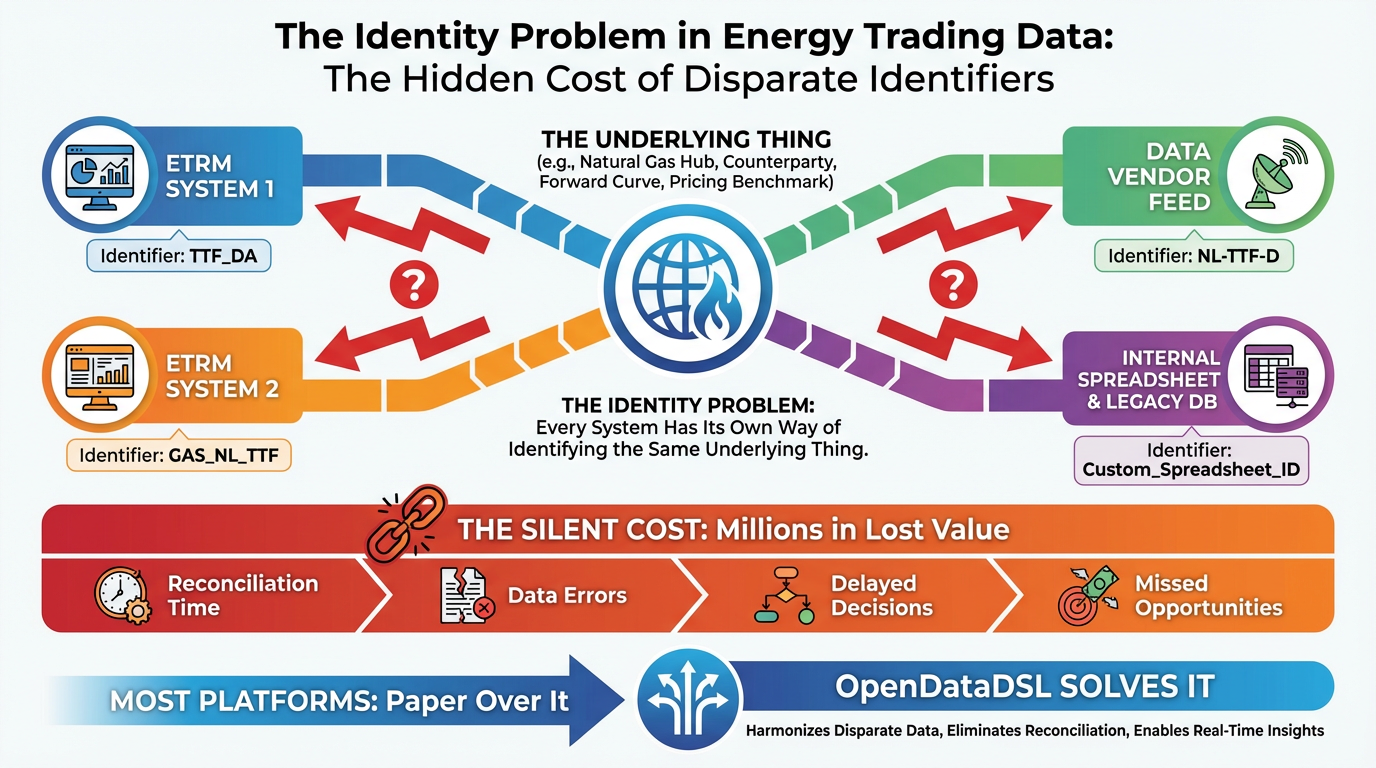 This is the identity problem, and it silently costs trading organisations millions in reconciliation time, data errors, delayed decisions, and missed opportunities. Most platforms paper over it. OpenDataDSL solves it.