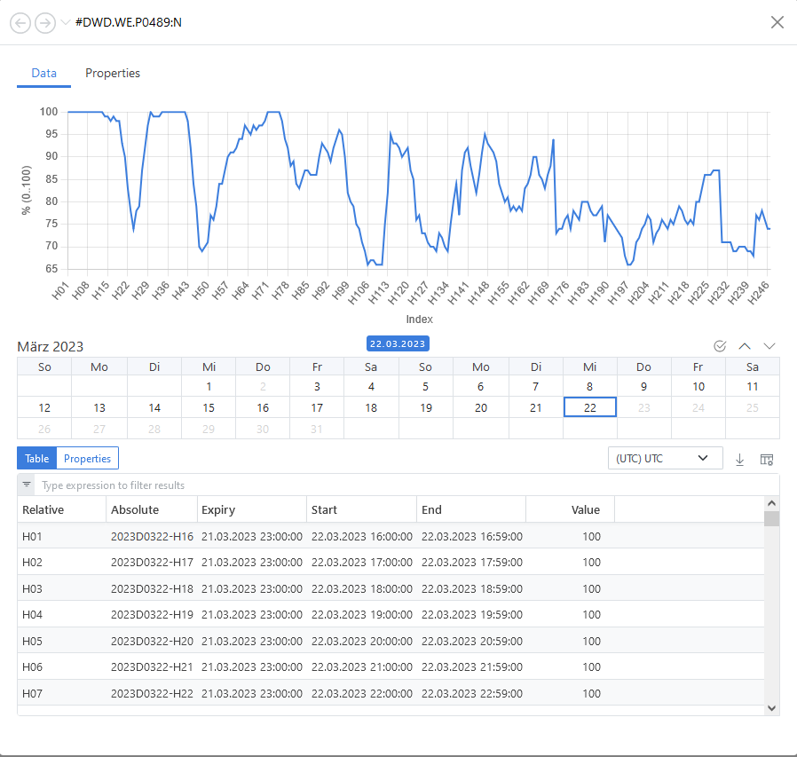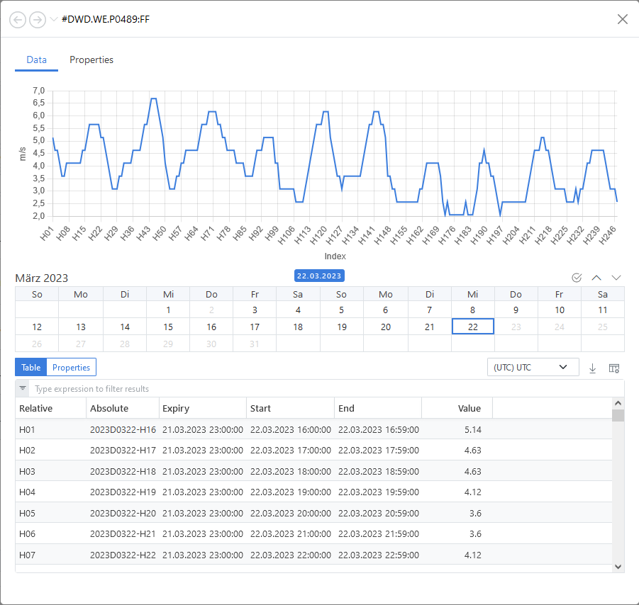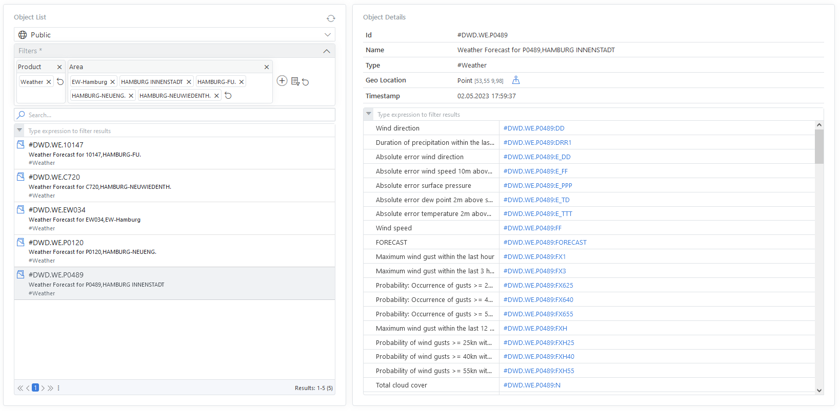 For the different weather stations in various locations we store the information in objects and their properties. The following screenshot gives a view how it looks like in the ODSL Web-Portal.