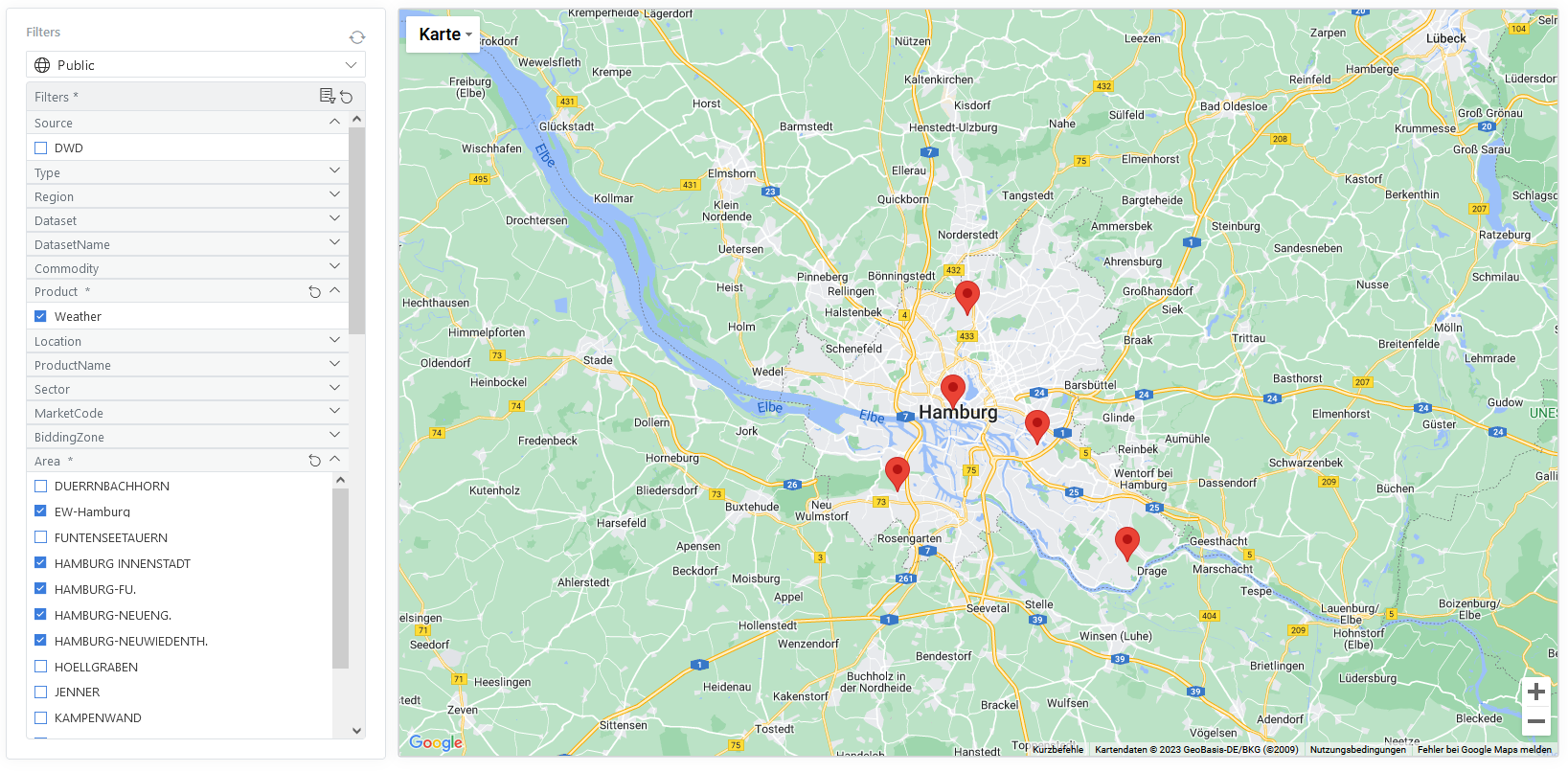 Storing and visualization of the geo data for the weather stations in Hamburg using the ODSL Web-Portal: